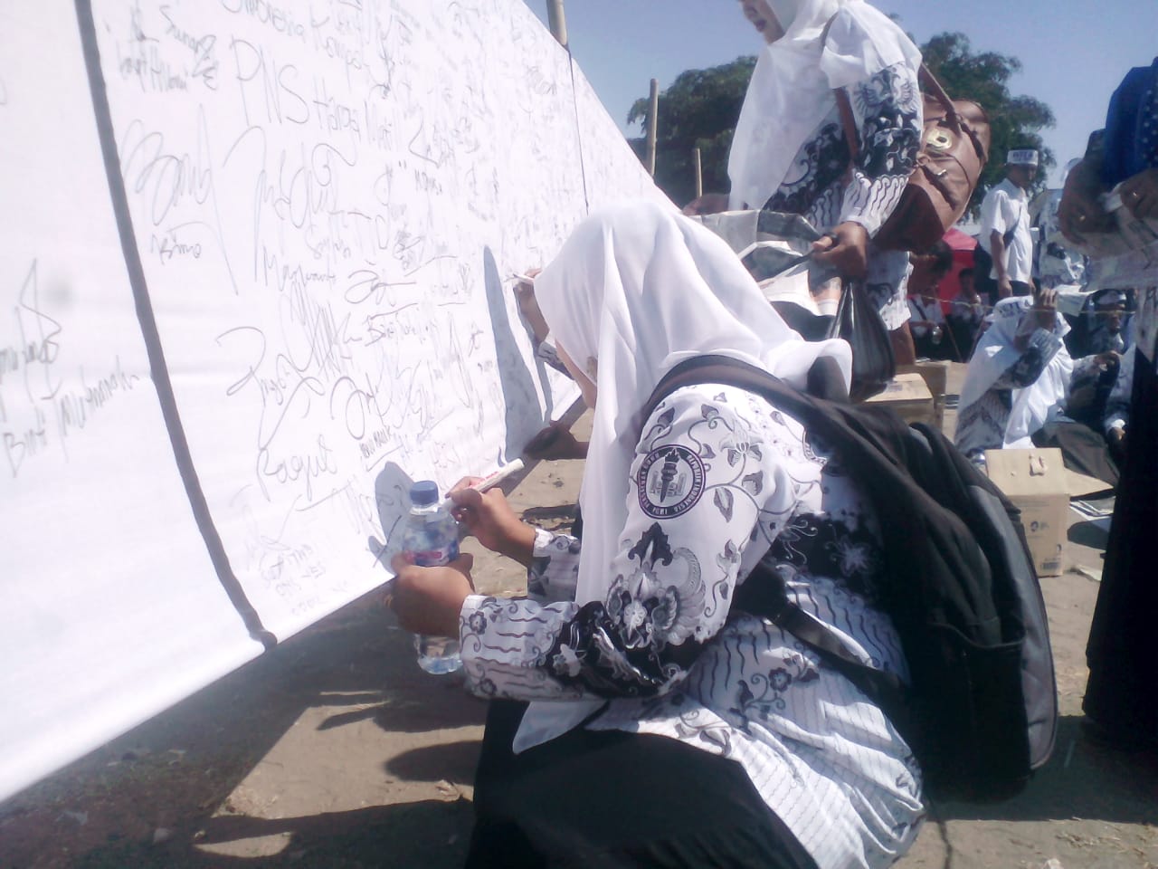Selain melakukan doa bersama dan orasi sebagai penyampaian tuntutannya, ribuan guru honorer tersebut juga membuat petisi dengan membubuhkan tanda tangan di kain putih sepanjang 70 meter.