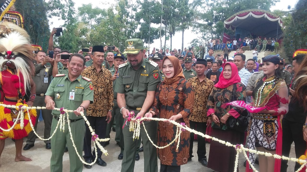 Foto : Bupati Ponorogo Ipong Muchlissoni Didampingi isteri Sri Wahyuni, Kadin PU Jamus dan Kades Kesugihan Sugeng Riyanto saat pemotongan pita serta tanda tangan peresmian jembatan