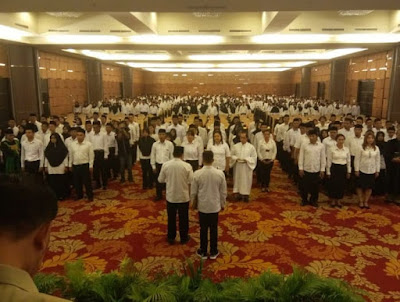 Bawaslu Kota Madiun melantik sebanyak 605 pengawas tempat pemungutan suara (PTPS) di Hotel Aston Kota Madiun, Senin (25/3/2019).
