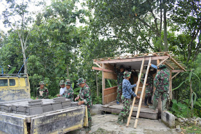 Seperti yang terlihat, saat anggota Satgas TMMD Ke-104 mulai memugar Poskamling lama yang berada di Dsn. Wonosari, Desa Pocol, Kec. Poncol, Kab. Magetan, Selasa (12/3/19).