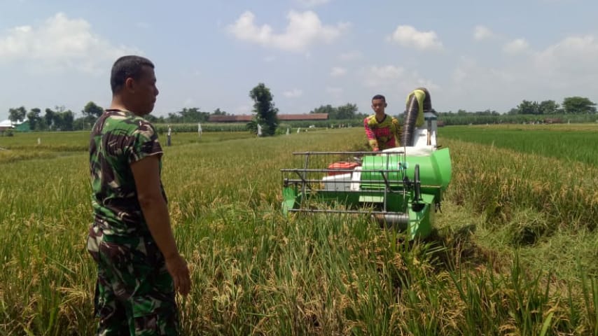 Dalam proses panen padi tersebut, Babinsa Desa Kepuhrejo mendampingi kegiatan panen yang menggunakan mesin panen padi jenis Combi ukuran kecil sedang memotong tanaman padi.