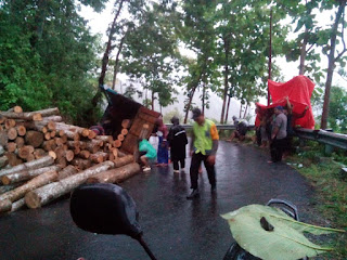 Karena jalan menurun dan menikung serta muatan penuh kayu sengon, truk Isuzu warna kuning bak biru tersebut berpapasan dengan mobil lain yang melaju dengan kencang di km 23 Desa Pelem Bungkal.