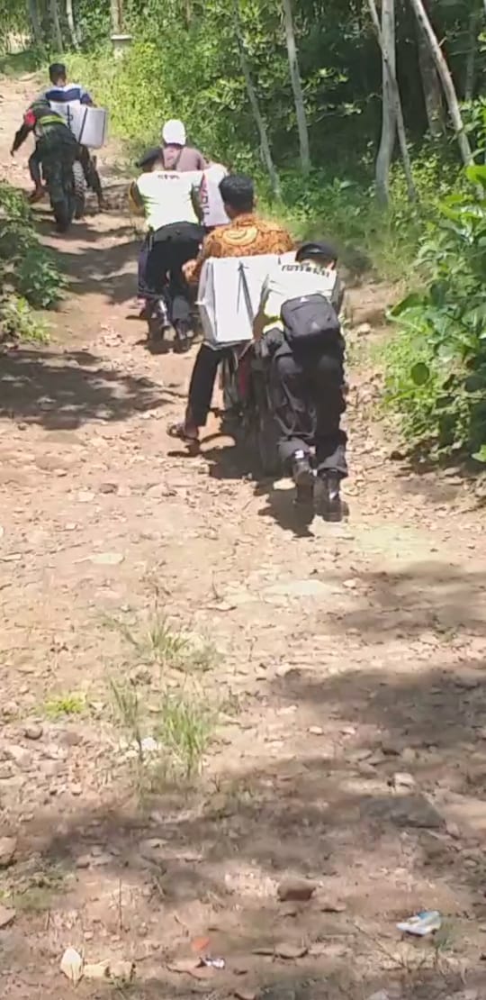 Sulitnya medan menjadi tantangan tersendiri bagi petugas KPPS, TNI-Polri saat pendistribusian logistik pemilu tersebut. Bahkan petugas terpaksa harus mendorong sepeda motor yang membawa logistik pemilu agar bisa sampai ke lokasi di TPS setempat.
