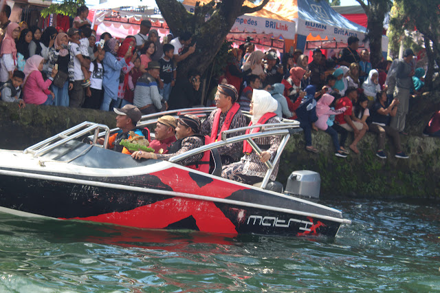 Sampai telaga, tumpeng berukuran besar dan gunungan hasil bumi diusung menggunakan `speed boat’ mengelilingi telaga yang berada di lereng Gunung Lawu dan memiliki luas 30 hektare.