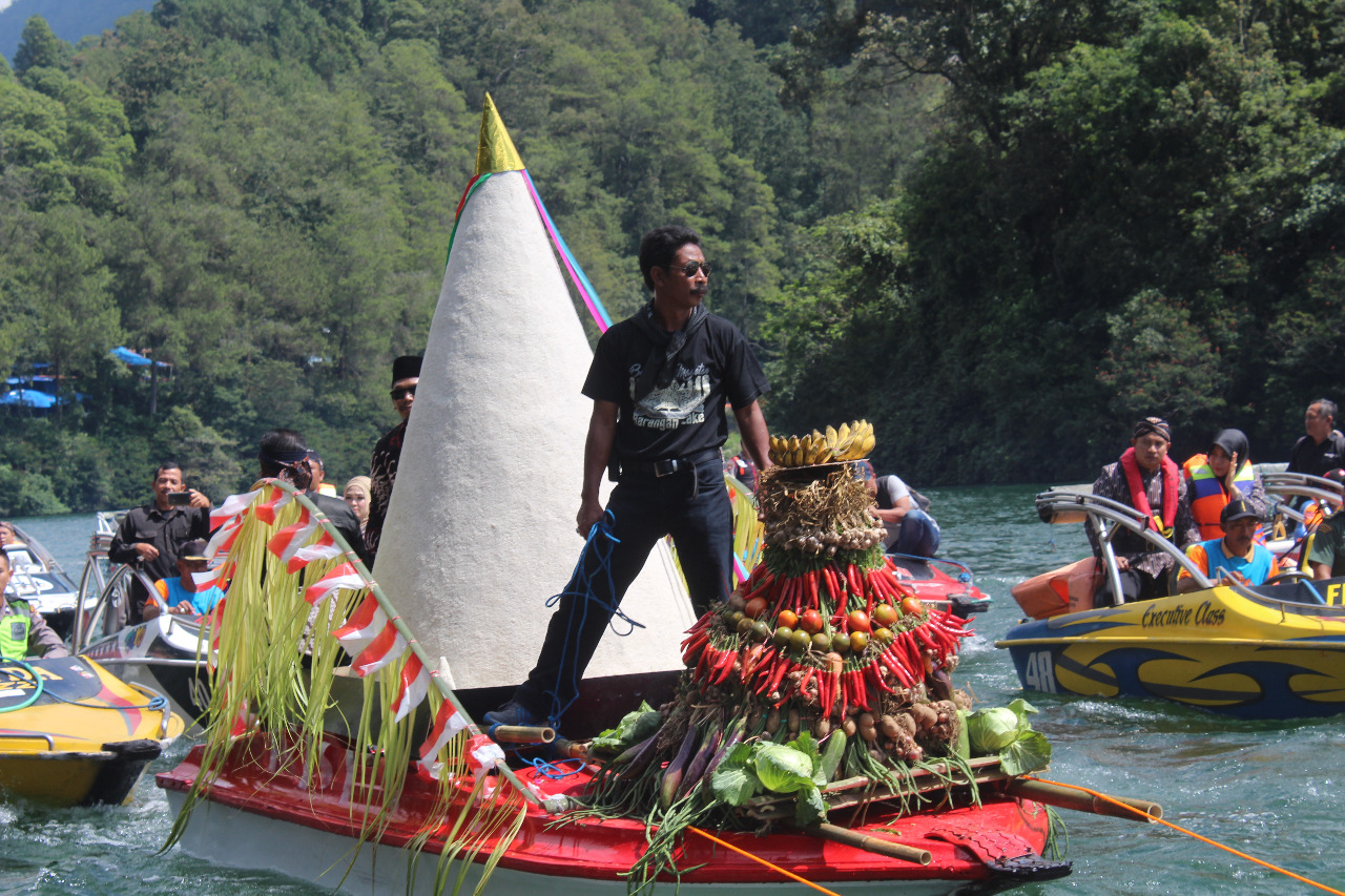 Sampai telaga, tumpeng berukuran besar dan gunungan hasil bumi diusung menggunakan `speed boat’ mengelilingi telaga yang berada di lereng Gunung Lawu dan memiliki luas 30 hektare.