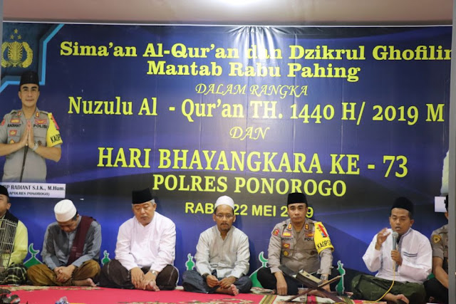 Sementara itu, Kapolres Ponorogo AKBP Radiant, SIK, M. Hum menyampaikan, sima’an Al-Qur’an dan Dzikrul Ghofilin ghofilin “Mantap” rabu pahing dalam rangka memperingati Nuzulul Qur’an 1440 H dan salah satu dari rangkaian kegiatan memperingati HUT Bhayangkara ke 73 tahun 2019.