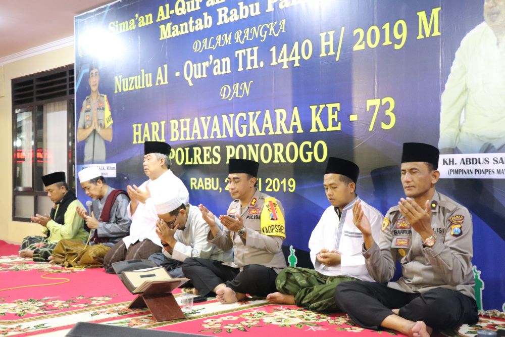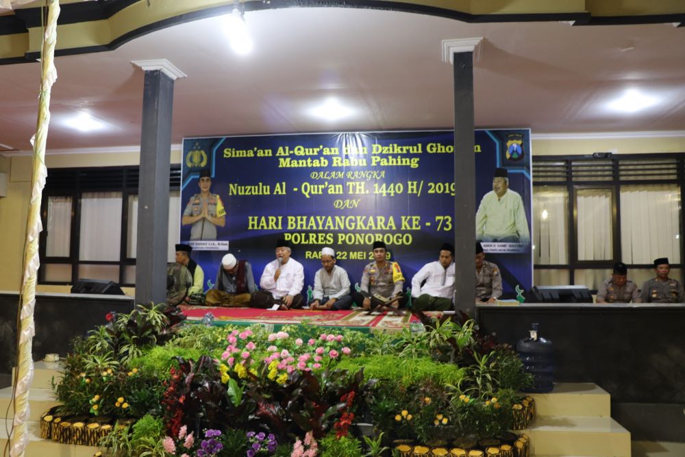 Sementara itu, Kapolres Ponorogo AKBP Radiant, SIK, M. Hum menyampaikan, sima’an Al-Qur’an dan Dzikrul Ghofilin ghofilin “Mantap” rabu pahing dalam rangka memperingati Nuzulul Qur’an 1440 H dan salah satu dari rangkaian kegiatan memperingati HUT Bhayangkara ke 73 tahun 2019.