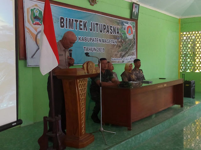Danramil 0804/09 Sukomoro Kapten Inf Efendi Santoso saat memberikan arahan kepada peserta bimtek mengajak kepada seluruh peserta Bimtek untuk ikut meningkatkan kwaspadaan terhadap kemungkinan terjadinya bencana. Tujuan Bimtek Jitu-pasna yaitu mengingat pentingnya dan pencegahan untuk mengurangi jatuhnya korban bila terjadi bencana,Danramil memaparkan kalau dari laporan Babinsa yang di tuangkan pada Tabulase Data kerawanan wilayah Sukomoro dalam beberapa terakhir ini hal yang menonjol adanya puting beliung dan kekeringan menerpa rumah warga dan angin kencang yang menumbangkan pohon di seputaran jalan,seperti kejadian tahun kemarin adanya pohon tumbang yang menimpa Dumtruk,hal ini yang termasuk bencana menonjol di wilayah Sukomoro.