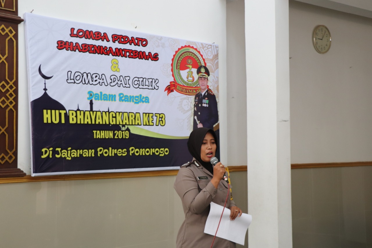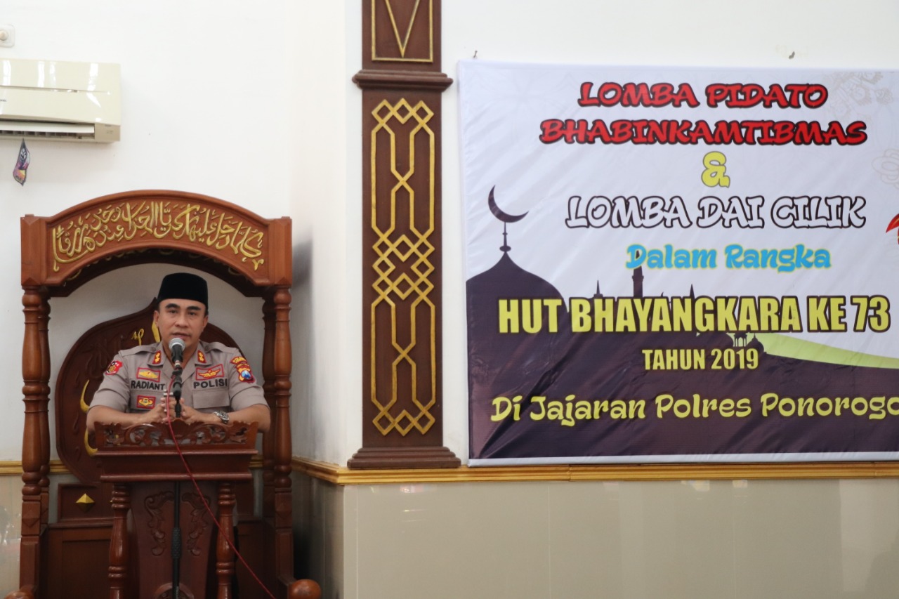 Kapolres Ponorogo AKBP Radiant, SIK, M.Hum menyampaikan, tujuan diadakannya lomba dai  tersebut, selain dalam rangka menyambut hari Bhayangkara ke-73, juga sebagai upaya meningkatkan keimanan dan ketakwaan anggota.