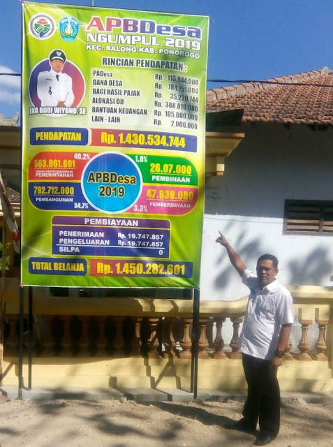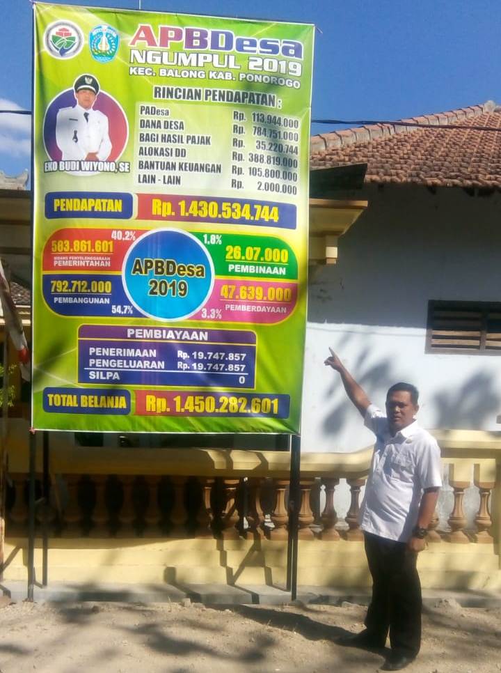 ”Untuk itu, pemerintah Desa Ngumpul menampilkan banner besar di depan kantor balai desa, agar warga masyarakat bisa melihat. Banner besar tersebut berisi tentang informasi Anggaran dan Pendapatan Belaja Desa (APBDesa) Tahun 2019. Bahkan banner tersebut menampilkan secara rinci mengenai semua pendapatan dan pengeluaran Desa Ngumpul tahun 2019. Ini adalah bentuk transparansi pemerintah Desa Ngumpul dalam penggunaan Anggaran dan Pendapatan Belaja Desa (APBDesa) Tahun 2019, “kata Eko Budi Wiyono saat dikonfrimasi di ruangnya, Rabu (17/7).