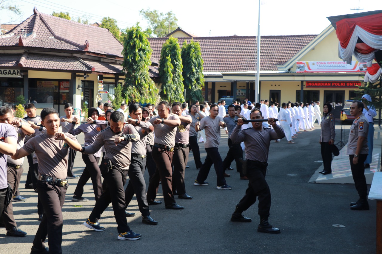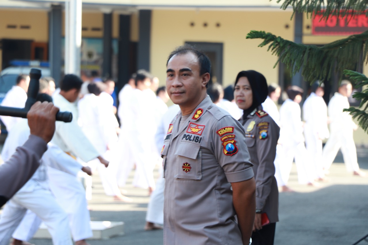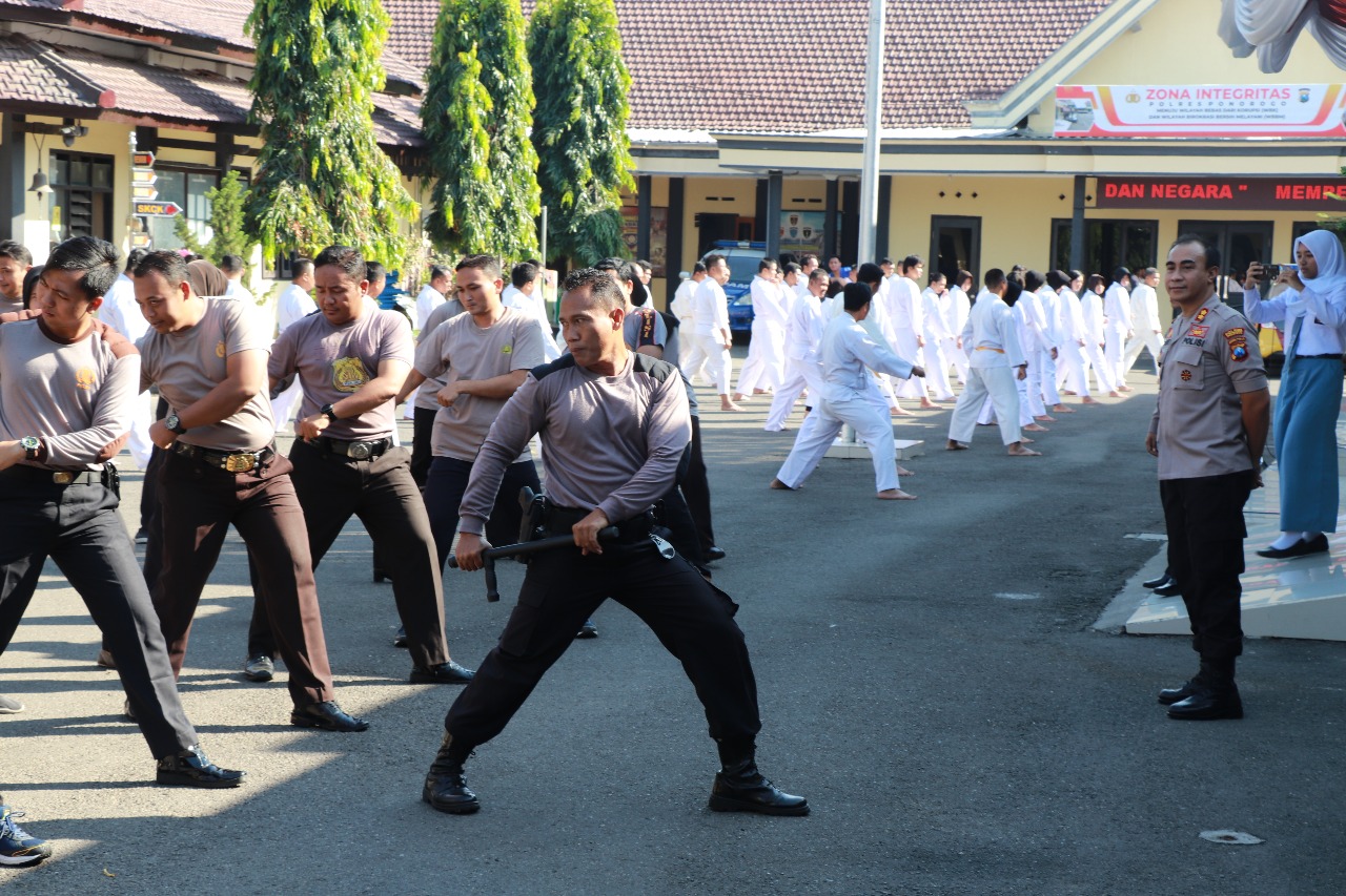 Ponorogo, Seputarkita – Guna untuk mengasah dan kemampuan beladiri para anggotanya, Kepolisan Resort Ponorogo menggelar latihan senam tongkat serta borgol di Mapolres setempat, Selasa (30/7).