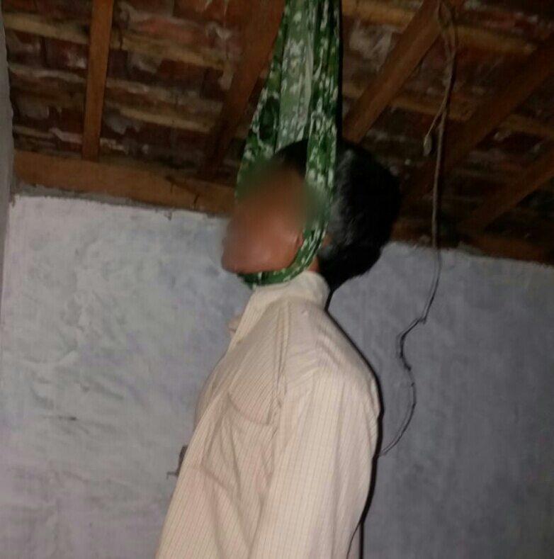 Karena penasaran isteri korban pun melihat dan mendapati korban sudah dalam keadaan menggantung di kayu usuk.
