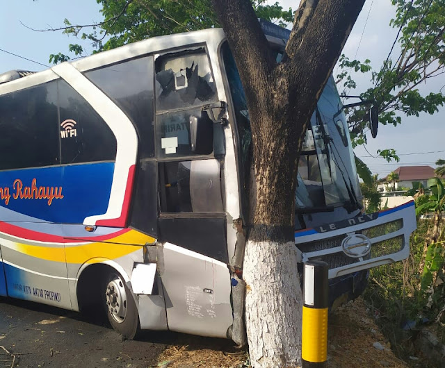 Bus Sugeng Rahayu nopol W 7727 UY menabrak pohon setelah berusaha menghindari emak – emak mengendarai sepeda motor yang belok mendadak melawan arus di bahu jalan.