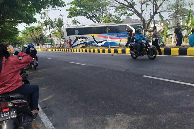 Madiun, Seputarkita – Kecelakaan bus terjadi di Jalan Ring Road Barat Kota Madiun, Sabtu siang (24/8). Tepatnya, sebelah selatan Asrama Haji, Madiun.