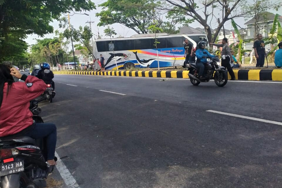 Sopir bus lantas banting setir ke lajur kanan. Nahas, pada saat bersamaan, di lajur kanan sedang melaju dua mobil yang beriringan. Sopir lalu banting setir ke kiri dan bus tersebut pun menyasak pohon di sisi jalan.