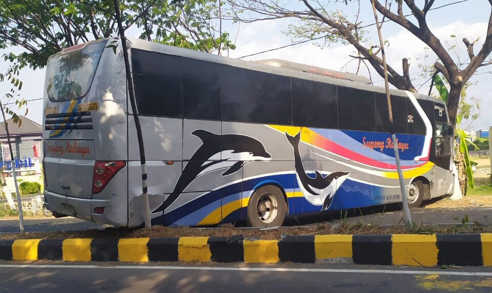 Bus Sugeng Rahayu nopol W 7727 UY menabrak pohon setelah berusaha menghindari emak – emak mengendarai sepeda motor yang belok mendadak melawan arus di bahu jalan.