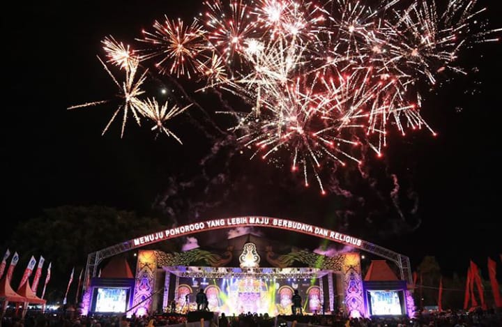 Kembang api menambah kemeriahan perayaan pembukaan Peringatan Hari Jadi Kabupaten Ponorogo Ke-523, Perayaan Grebeg Suro, dan Festival Budaya Bumi Reyog Platform Indonesiana tahun 2019