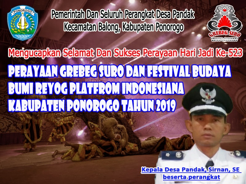 Pemerintah Dan Seluruh Perangkat Desa Pandak Kecamatan Balong Kabupaten Ponorogo Mengucapkan Selamat Dan Sukses Perayaan Hari Jadi Ke-523, Perayaan Grebeg Suro Dan Festival Budaya Bumi Reyog Platfrom Indonesiana Kabupaten Ponorogo Tahun 2019
