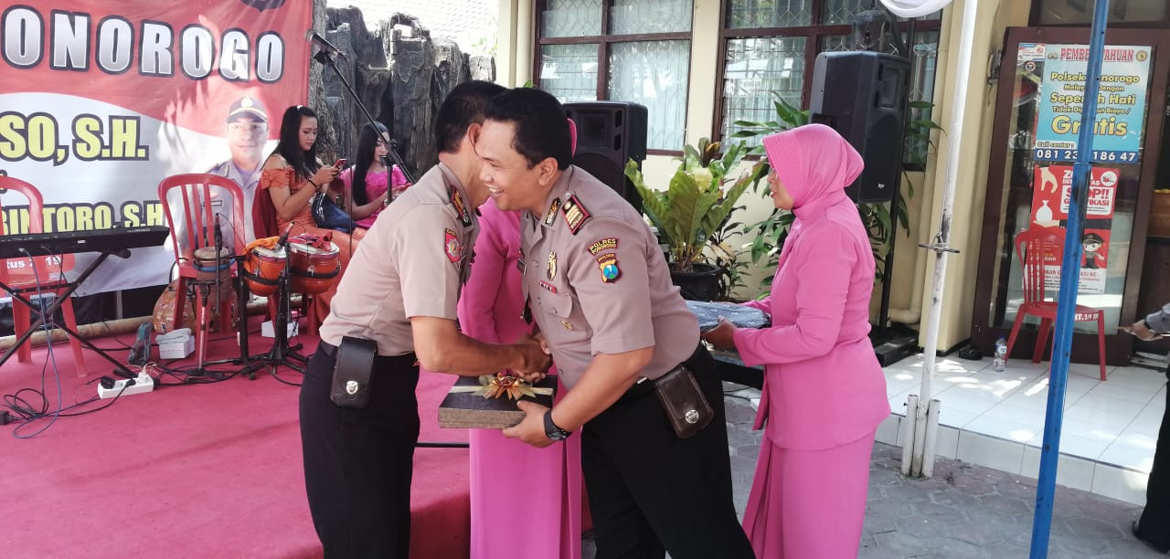 Untuk menambah rasa kekeluargaan acara Pisah Sambut, Anggota Polsek Ponorogo dan Bhayangkari menyerahkan cinderamata kepada Iptu Suroso, SH yang di serahkan oleh Kapolsek Ponorogo AKP Haryo Kusbintoro, SH dan di akhiri dengan ramah tamah dan hiburan elektone.