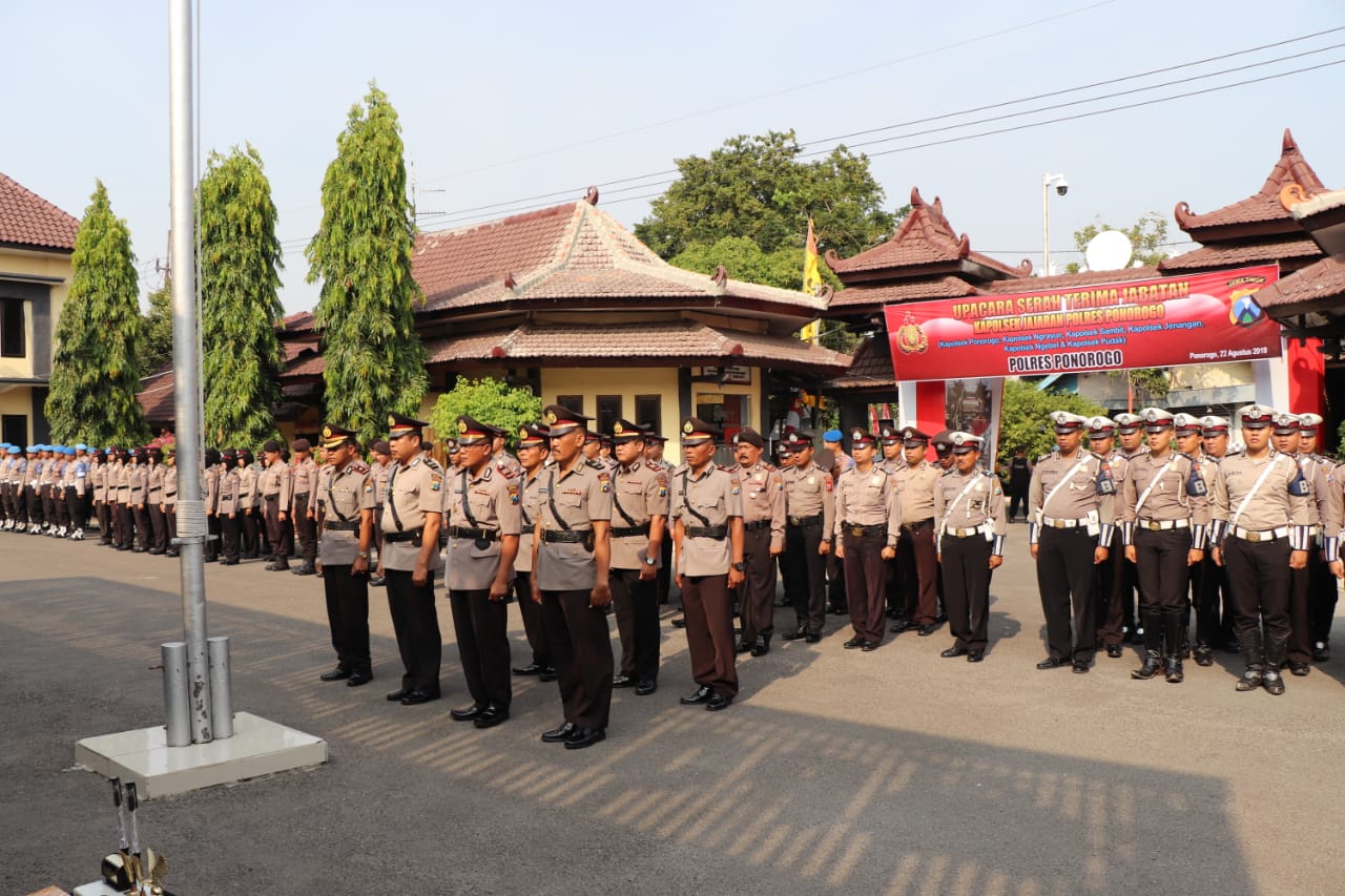 Ponorogo, Seputarkita – Kepolisian Resort Ponorogo menggelar upacara serah terima jabatan (Sertijab) sejumlah Kapolsek di halaman Mapolres setempat, Kamis (22/8).