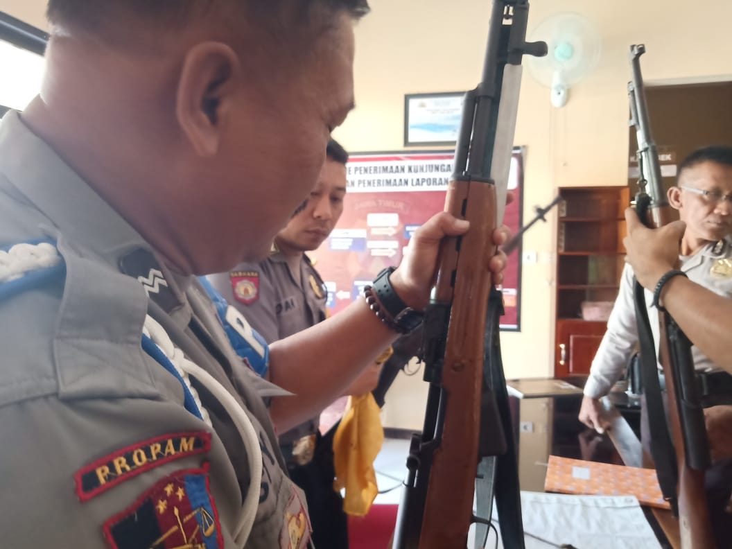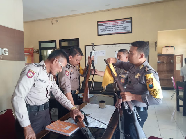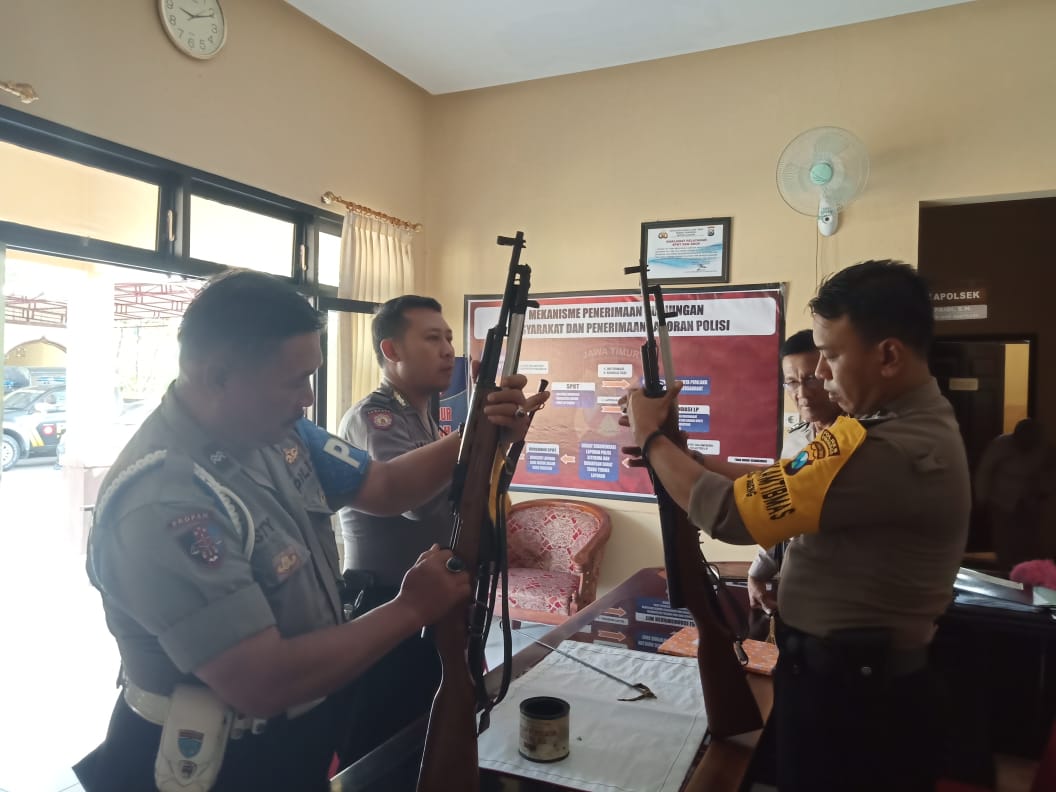 Petugas dari Polsek Slahung saat melakukan pemeriksaan dan perawatan senjata api inventaris