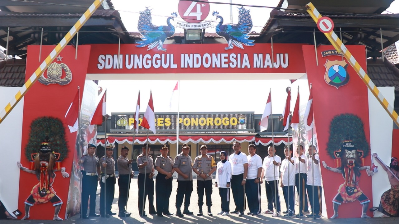 Kapolres Ponorogo AKBP Radiant SIK, M.Hum menyampaikan, pembuatan gapura tersebut, dalam rangka menyemarakan Hari Ulang Tahun Kemerdekaan Republik Indonesia ke-74, bertuliskan “SDM UNGGUL INDONESA MAJU” dengan tema kesenian tradisional khas Ponorogo yakni reyog.