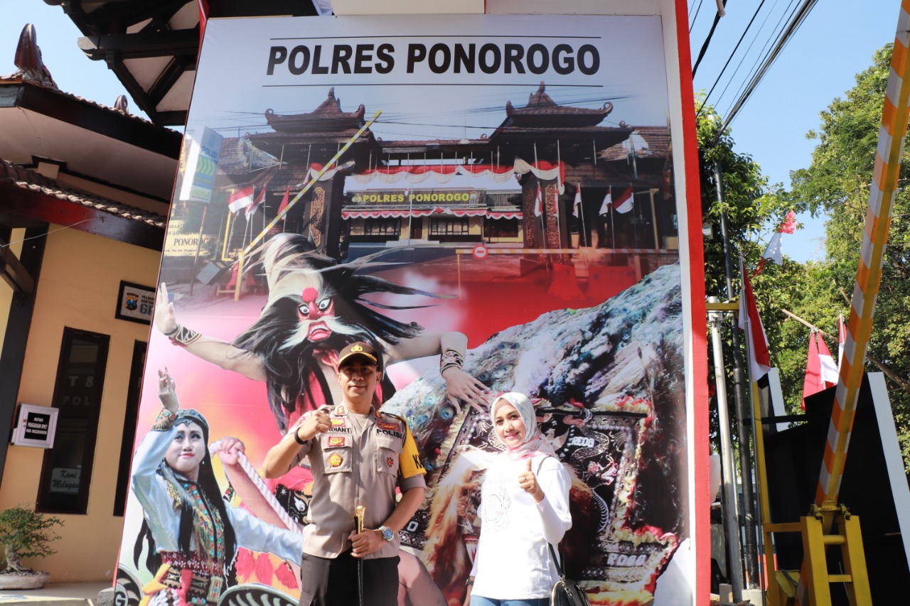 Gapura yang dibuat bergambar kesenian asli Kabuaten Ponorogo reyog dengan beragam warna merah putih di gerbang pintu masuk Mapolres Ponorogo.