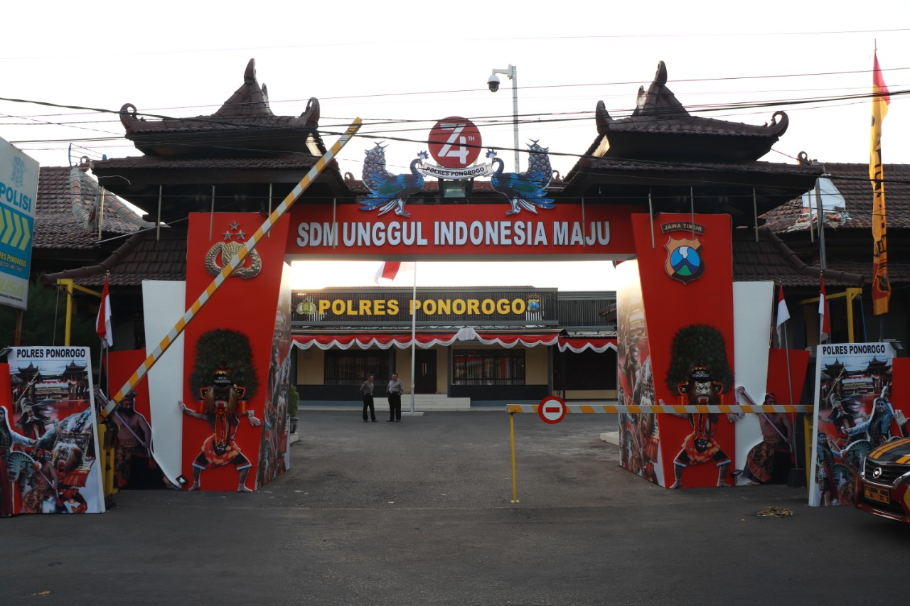 Ponorogo, Seputarkita – Memperingati dan menyemarakkan HUT Kemerdekaan Republik Indonesia Ke-74, Polres Ponorogo membuat gapura di pintu masuk Mapolres setempat, Jum’at (16/8).