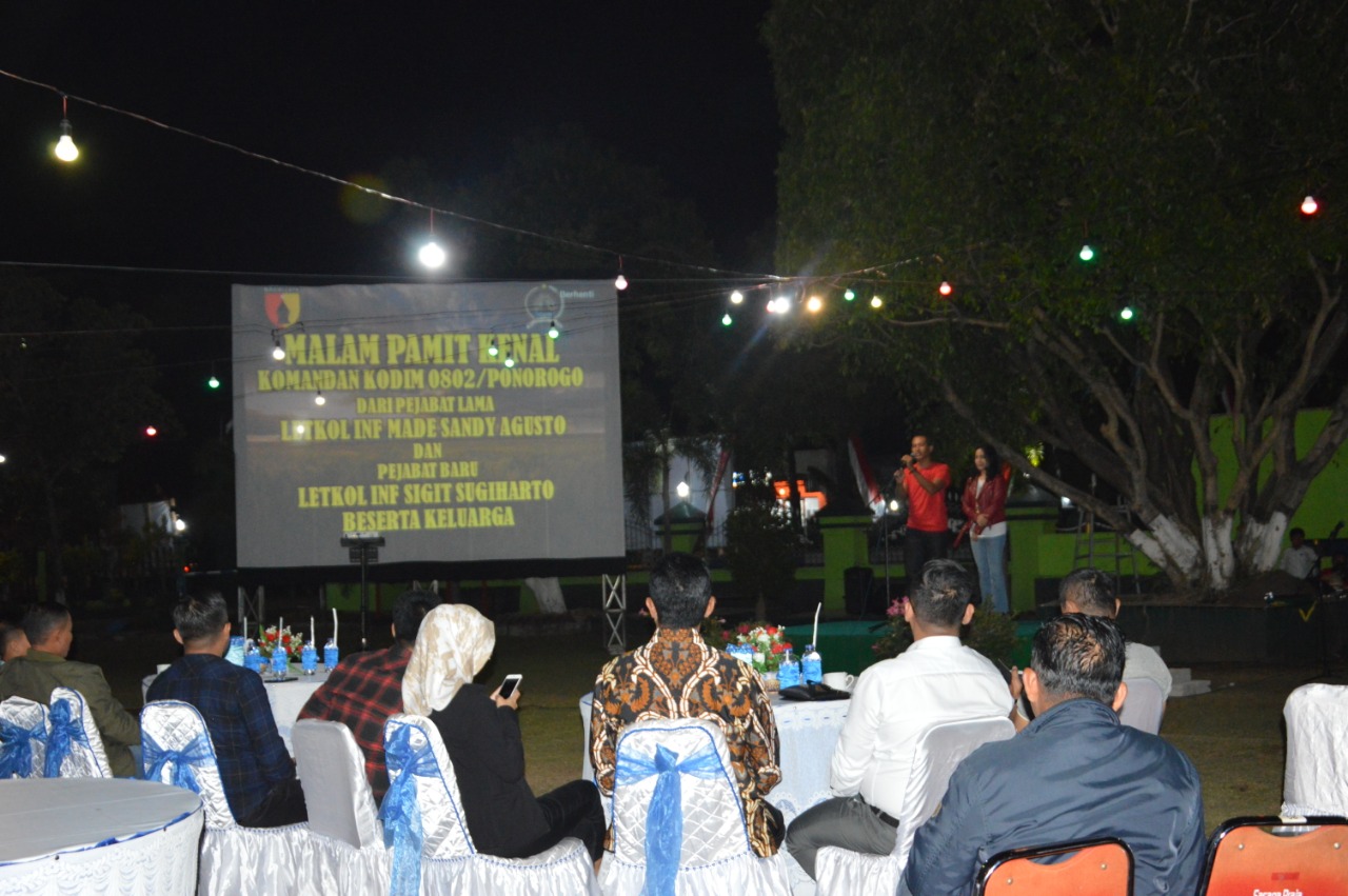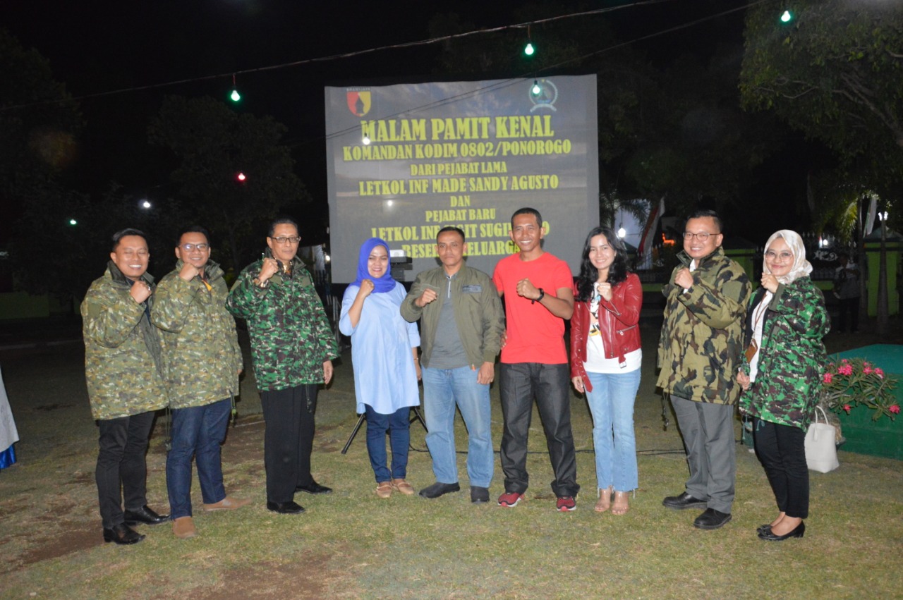 Ponorogo, Seputarkita – Usai pelaksanaan serah terima jabatan Komandan Kodim 0802/Ponorogo tanggal 13 Agustus di Batalyon Infanteri 511/DY Blitar, malamnya bertempat di lapangan apel Kodim 0802/Ponorogo, digelar acara pamit kenal antara pejabat lama Dandim 0802/Ponorogo, Letkol Inf Made Sandy Agusto dengan pejabat yang baru Letkol Inf Sigit Sugiharto, Rabu(14/08/2019).