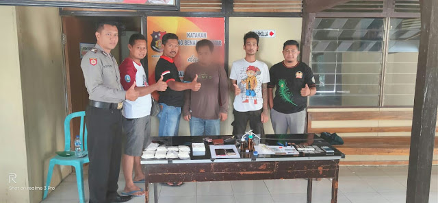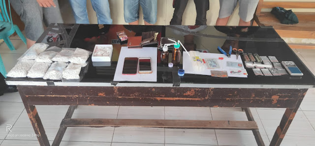 “Selain mengamankan para tersangka, petugas juga mengamankan barang bukti berupa 6 palstik klip yang berisikan serbuk kristal yang diduga sabu yang kesemuanya kurang lebih seberat 1,8 gram, 1 buah Timbangan Digital, 3 korek api, 2 buah Bong, 7 bungkus platik yang masing masing palstik berisikan 1000 pil doubel L atau seluruhnya berjumlah 7000 pil doubel L, 8 bungkus platik yang masing masing palstik berisikan 50 butir pil doubel L atau seluruhnya berjumlah 400 pil doubel L, 1 buah plastik warna putih yang berisikan 1.000 butir pil doubel L, 1 linting kertas yang berisikan 3 butir pil doubel L, 2 butir pil doubel L, 1 buah plastik warna putih yang berisikan 4 butir pil doubel L, 1 buah Handphone Xiaomi warna putih, yang berisikan Whats App percakapan transaksi Pil double L, 1buah HP merk oppo, 1 buah HP merk samsung, 2 buah ATM, 1 buah gunting, dan 1 buah tang potong. Para tersangka terjerat dengan pasal 112 Ayat (1) UU RI No.35 Tahun 2009 Tentang Narkotika, dan pasal 196 atau 197 UU RI No.36 Tahun 2009 Tentang Kesehatan. Selanjutnya para tersangka berikut barang bukti langsung di bawa ke kantor Polisi untuk di lakukan pemeriksaan lebih lanjut, “pungkas Kasubbag Humas Iptu Edi Sucipta. (Sul)