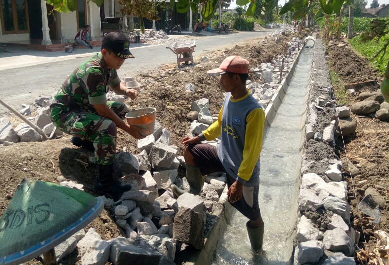 Magetan, Seputarkita – Bintara Pembina Desa (Babinsa) Desa Lembeyan wetan Koramil 0804/12 Lembeyan Serda Edy Ruswanto membantu warga yang sedang kerja bakti pembuatan saluran irigasi, Saluran tersebut untuk mengairi sawah warga Desa Lembeyan wetan,Kec.Lembeyan,Kab.Magetan.Selasa (03/09/2019).