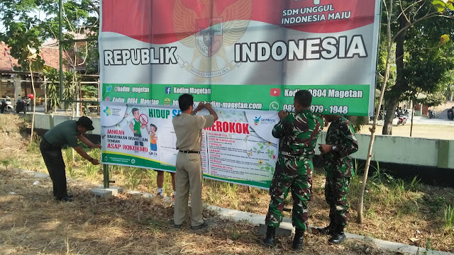 Magetan, Seputarkita – Untuk menjaga lingkungan yang sehat, terutama terhadap polusi asap rokok, pada bulan September 2019 ini wilayah Kecamatan Takeran, Kabupaten Magetan, Koramil 0804/11 Takeran dengan Puskesmas Takeran melaksanakan pemasangan banner untuk mengajak warga agar “HIDUP SEHAT TANPA MEROKOK” dibeberapa kawasan agar terlihat dan terbaca oleh warga masyarakat yang lewat. Di Kecamatan Takeran sendiri sudah terdapat beberapa banner yang telah terpasang seperti lokasi depan Koramil Takeran, Puskesmas Takeran, pasar serta beberapa tempat yang strategis.