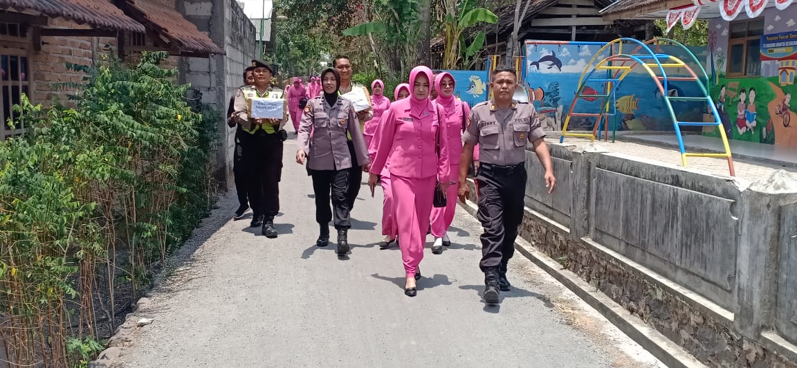 Kapolsek Pulung AKP Denny Fahrudianto bersama anggota, Ranting Bhayangkari Pulung memberikan bantuan kepada warga kurang mampu