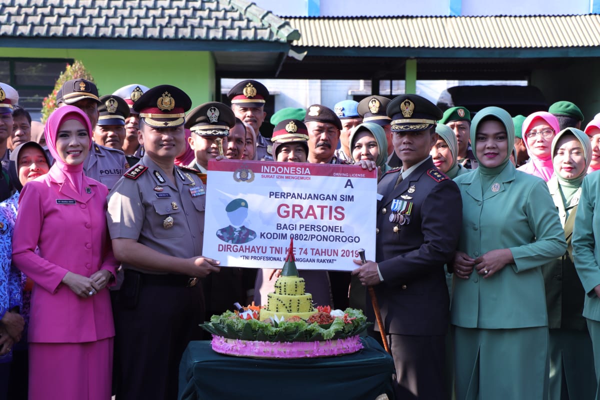 Pada kesempatan tersebut, selain pemotongan tumpeng HUT TNI ke-74 tahun 2019 juga dilakukan penyerahan tanda perpanjangan SIM A gratis kepada anggota Kodim 0802/ Ponorogo oleh Kapolres Ponorogo diserahkan kepada Dandim 0802/ Ponorogo.