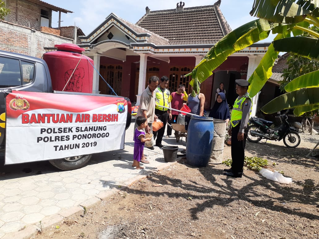 Kapolsek Slahung AKP Paidi, SH menyampaikan, selain melakukan patroli rutin, petugas juga menyalurkan bantuan air bersih kepada warga masyarakat yang dilanda kekeringan dan kesulitan kebutuhan air bersih akibat kemarau panjang.