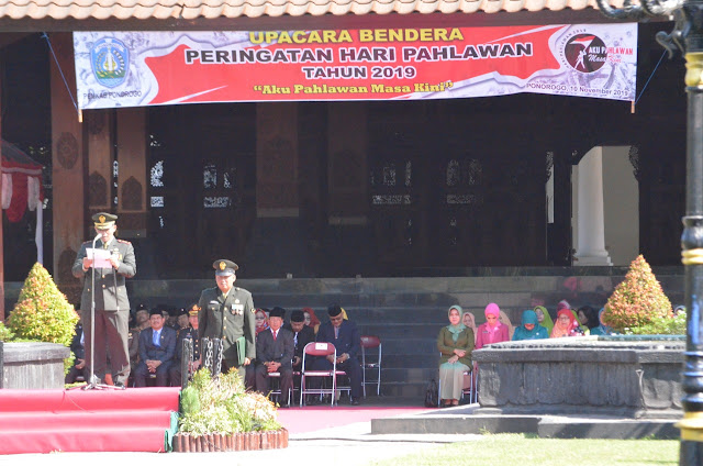 Dalam upacara bendera peringatan Hari Pahlawan tahun 2019 dengan tema “Aku Pahlawan Masa Kini”, yang diikuti oleh TNI-Polri, Satpol PP, Linmas, Korpri, Mahasiswa, Pelajar dan Pramuka dengan irup Dandim 0802 Ponorogo Letkol Inf. Sigit Sugiharto serta dihadiri Kapolres Ponorogo AKBP Arief Fitrianto, Wabup Soedjarno, Sekda Agus Pramono, Wakil Ketua DPRD Ponorogo Anik Suharto, Ketua Pengadilan Negeri Ahmad Satibi, Kajari Indah Laila, Kepala OPD, serta Forkompimcam se Kabupaten Ponorogo.