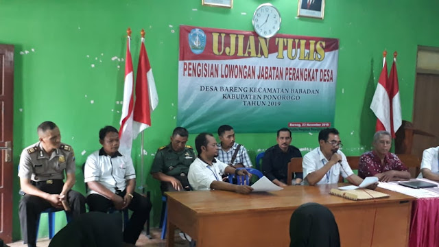 Kepala Desa Bareng Makmur Khafid Rosidy menyampaikan, panitia pengisian perangkat Desa melaksanakan ujian tes tulis untuk lowongan jabatan perangkat Desa Bareng. Hal tersebut berdasarkan ketentuan pasal 34 ayat (7) Peraturan Bupati Ponorogo Nomor 70 Tahun 2018 tentang Petunjuk Pelaksanaan Daerah Kabupaten Ponorogo nomor 3 Tahun 2017 tentang Perangkat Desa.
