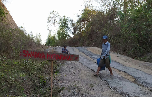 Mengingat akan datang musim penghujan dan menunggu pembangunan dari pemerintah provinsi belum kunjung datang membuat warga secara sukarela mengumpulkan material untuk memperbaiki kerusakaan jalan agar mobilitas masyarakat tidak terhambat.