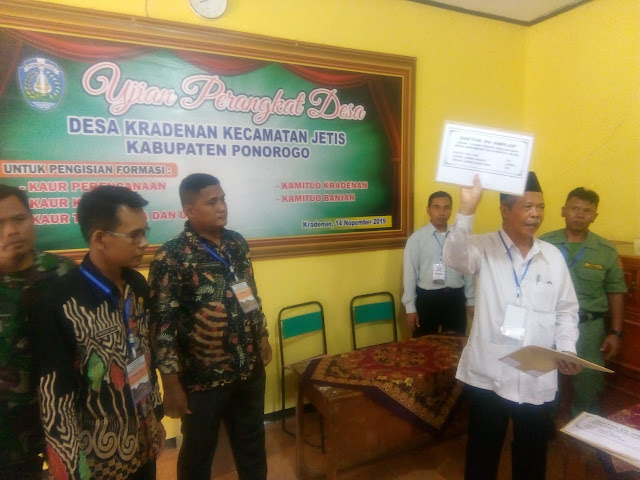 Kepala Desa Kradenan, Yahman, S.Pd menyampaikan, berdasarkan ketentuan pasal 34 ayat (7) Peraturan Bupati Ponorogo Nomor 70 Tahun 2018 tentang Petunjuk Pelaksanaan Daerah Kabupaten Ponorogo nomor 3 Tahun 2017 tentang Perangkat Desa, Panitia Pengisian Perangkat Desa, Desa Kradenan melaksanakan ujian Perangkat Desa.