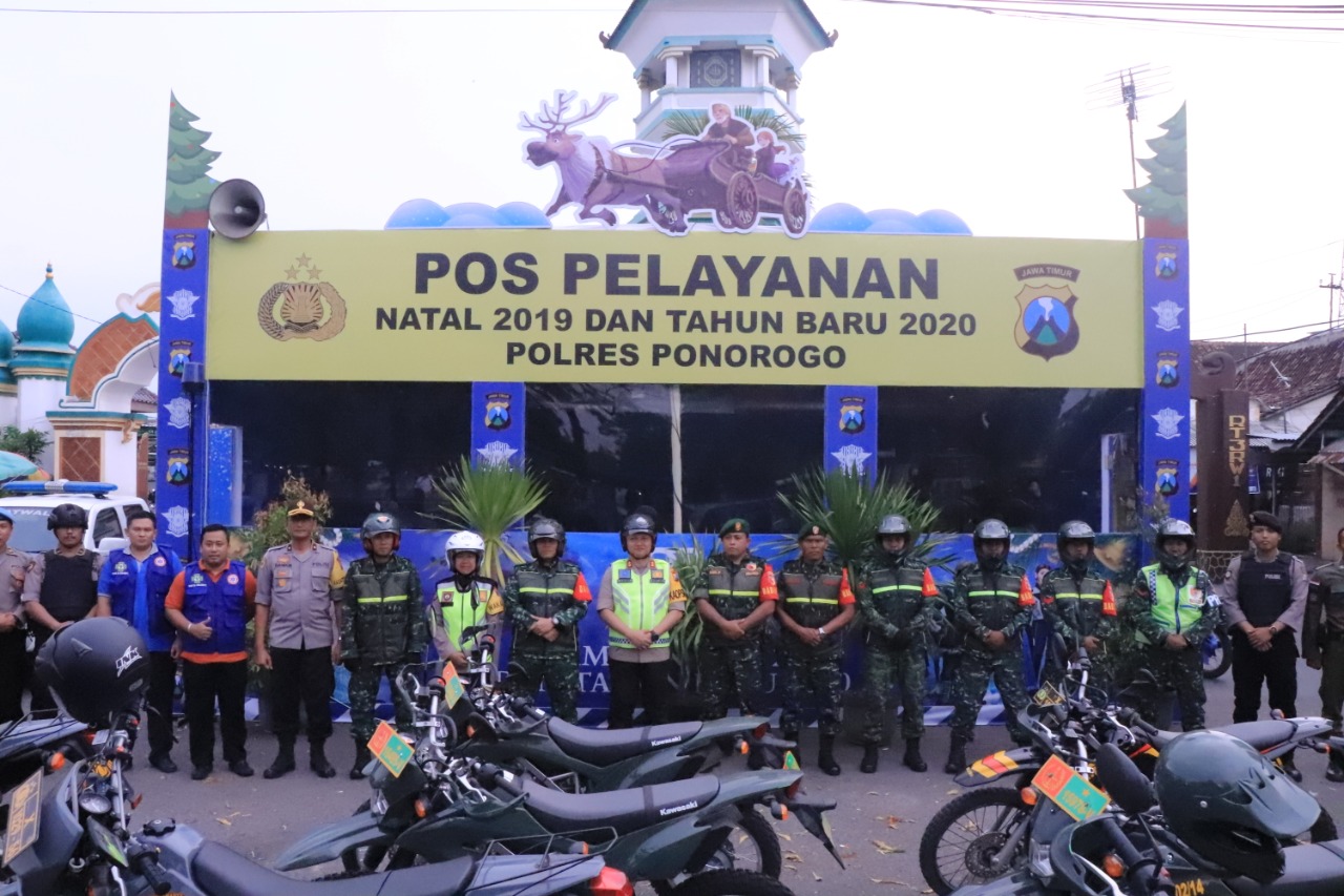 Ponorogo, SeputarKita – Menjelang Perayaan Natal dan Tahun Baru 2020, petugas dari Polres Ponorogo bersama Kodim 0802/Ponorogo, melakukan patroli kesejumlah gereja sambil pengecekan dan kesiapan pos pelayanan dan pengamanan, Selasa (24/12).
