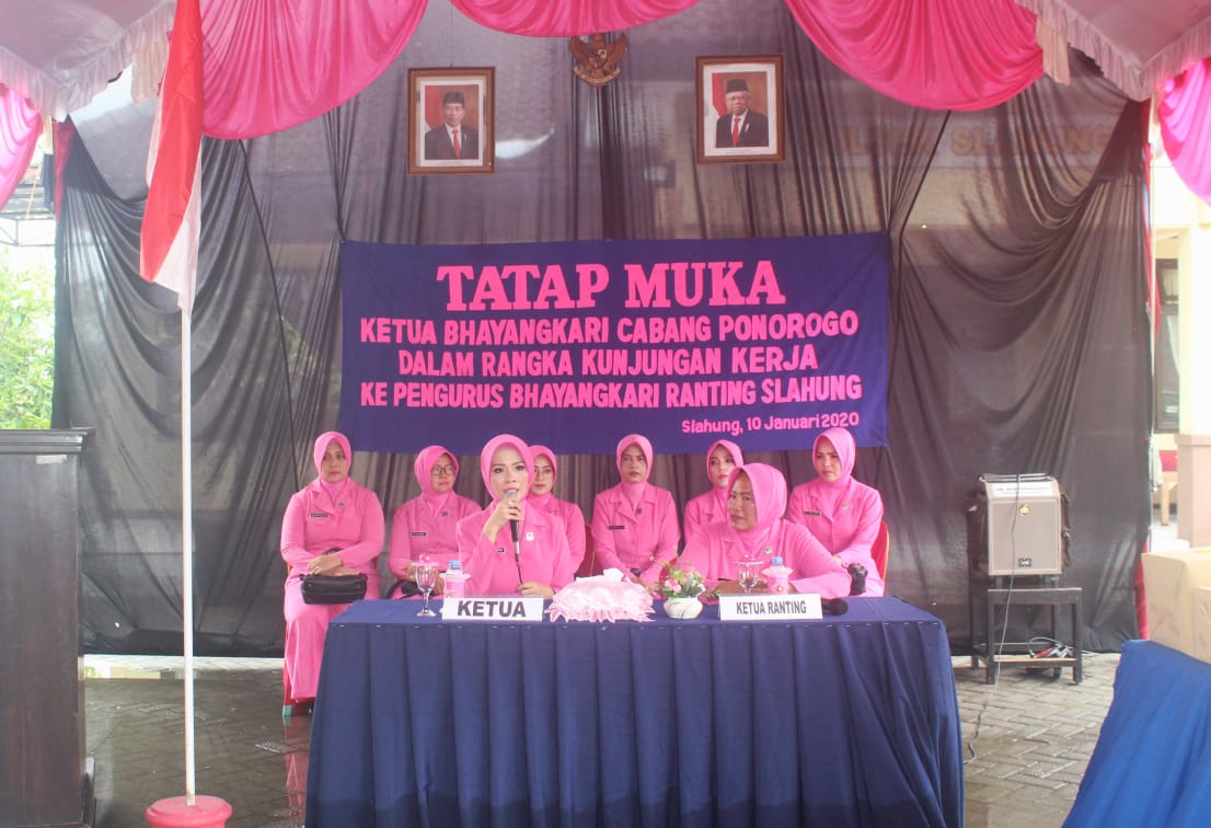 Kemudian Ketua Bhayangkari cabang Ponorogo Inanda Arief beserta pengurus cabang langsung mengadakan pemeriksaan administrasi di ruang Bhayangkari Ranting Slahung, dilanjutkan tatap muka dengan ibu ibu Bhayangkari Ranting Slahung.