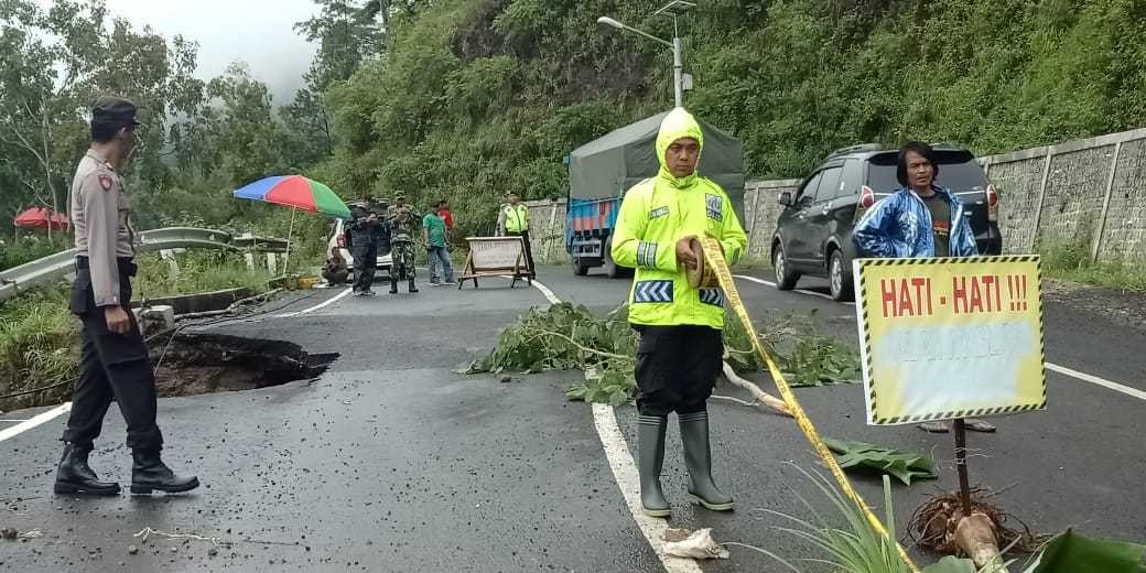 Ponorogo, Seputarkita – Akibat hujan yang mengguyur dengan intensitas yang tinggi, membuat jalur Ponorogo-Pacitan KM 226/KM 32 tepatnya di Desa Wates Kecamatan Slahung Kabupaten Ponorogo mengalami amblas, Kamis (20/2).