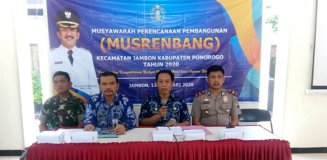 “Musrenbang ditingkat Kecamatan ini, dalam rangka untuk menyerap aspirasi, usulan dan harapan dari masyarakat dalam rangka penyusunan Rencana Kerja Pemeriksaan Daerah (RKPD) Kabupaten Ponorogo Tahun 2021. Berbagai usulan prioritas pembangunan maupun kegiatan disampaikan oleh elemen masyarakat yang sebelumnya dilakukan Musrenbang ditingkat Desa, “kata Camat Jambon Shandra Aji Hidayanto S.STP.