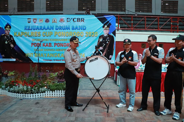 Ponorogo, Seputarkita – Polres Ponorogo menggelar kejuaraan Drum Band Kapolres Cup Ponorogo 2020 (D,CBR Open Turnament Series) dalam rangka memperingati HUT Bhayangkara Ke-74 di GOR Singodimedjo, Minggu (15/3).