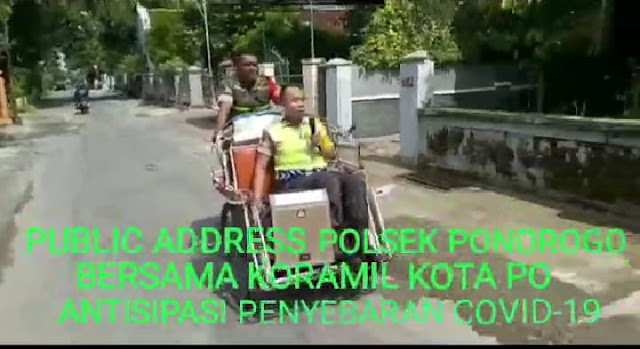 “Ini adalah sosialisasi dan himbauan dalam upaya untuk mencegah dan menanggulangi penyebaran virus corona (Covid-19) di wilayah Kecamatan Ponorogo, dengan cara keliling menggunakan becak dan pengeras suara sasaran warga masyarakat oleh petugas dari Polsekta Ponorogo dan Koramil Kota, “kata Kapolsekta Ponorogo AKP Haryo Kusbintoro, Minggu (22/3).