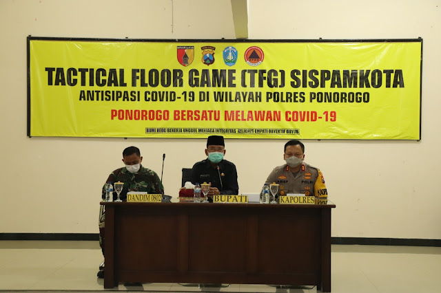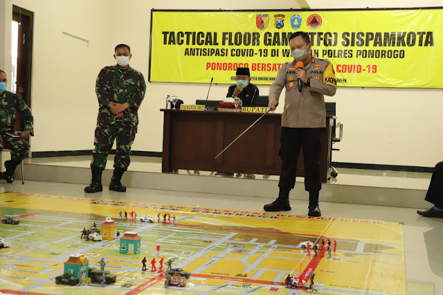 Kapolres Ponorogo AKBP Arief Fitrianto, SH, SIK, MM selaku penanggung jawab kegiatan diantaranya menyampaikan, Tactical Floor Game (TFG) Sispamkota ini adalah salah satu sarana untuk simulasi atau sebagai langkah antisipasi dampak yang ditimbulkan dari mewabahnya pandemi Covid 19 terutama masalah keamanan di wilayah Ponorogo.