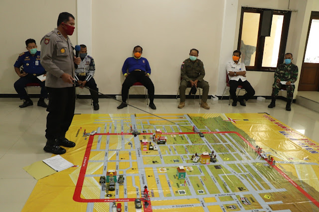 “Dan saat ini, kita juga telah mendirikan Pos Pemeriksaan di seluruh akses masuk Kabupaten Ponorogo dan mendirikan Pos di Terminal Seloaji guna antisipasi pendatang dan pemudik serta melaksanakan kegiatan patroli gabungan untuk menghimbau masyarakat agar tidak berkumpul. Terkait perkembangan virus Covid 19, wilayah DKI Jakarta telah dinyatakan sebagai wilayah PSBB dan kita berharap hal itu tidak terjadi di Ponorogo. Namun kita perlu mengantisipasi pemudik yang mulai berdatangan, dan kami harapkan untuk Pos di Terminal Seloaji ada penambahan dari Dinkes Kabupaten Ponorogo. Untuk skenario simulasi Tactical Floor Game (TFG) di wilayah Ponorogo, yakni simulasi kali ini diasumsikan adanya peningkatan kasus Covid 19 sehingga Kepala Daerah menurut PP 21 Tahun 2020 dengan persetujuan Kemenkes RI menyatakan bahwa Kabupaten Ponorogo memberlakukan PSBB sehingga kita asumsikan langsung menggelar pasukan yang menempati berbagai lokasi, seperti diperempatan Jenes, perempatan Imam Bonjol, perempatan Keniten, perempatan Pabrik Es, erempatan Pasar Pon, perempatan IAIN, perempatan Jeruksing dan perempatan Tonatan. Untuk jalan kecil, kita memerlukan bantuan relawan dan peralatan dari Dishub Ponorogo. Kita asumsikan pada pelaksaan PSBB ada pihak yang tidak setuju dan melakukan unras, berkaitan ini Polres Ponorogo akan menyiapkan dalmas awal dan negosiator, oleh karena itu untuk TNI/Polri harus menyiapkan personel sehingga siap sewaktu-waktu, menjaga stabilitas masyarakat agar tetap berjalan, fan tetap harus memberikan himbauan kepada masyarakat untuk physical distancing, wajib pemakaian masker dan pola hidup bersih serta tidak berkerumun, “pungkasnya.(sul)