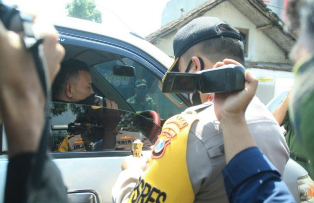 Kapolres Ponorogo AKBP Arief Fitrianto dan petugas memeriksa kendaraan atau pemudik yang melintas masuk Ponorogo di perbatasan Biting