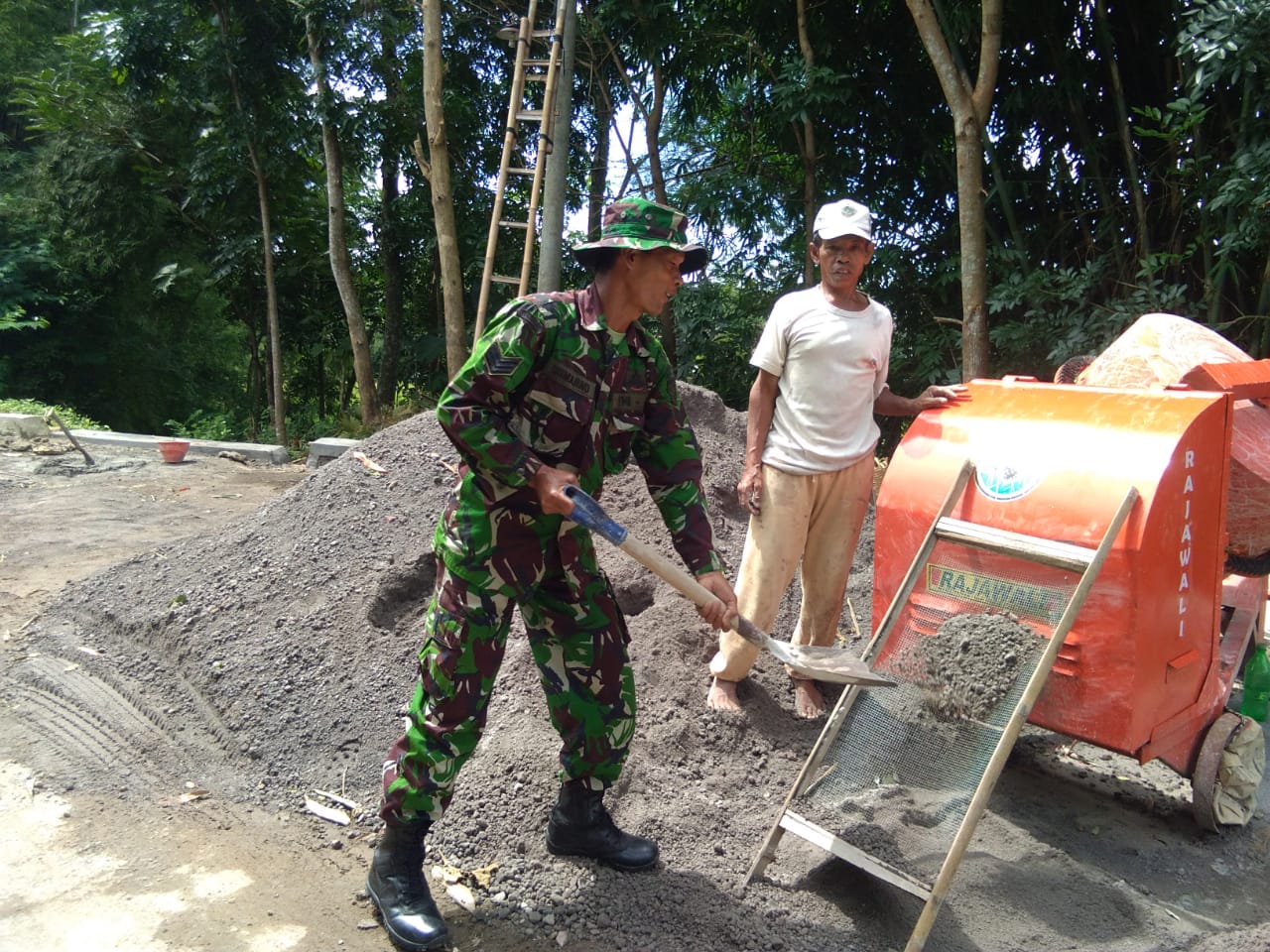 Magetan, Seputarkita – Anggota Koramil 0804/02 Plaosan, Bintara Pembina Desa (Babinsa) membantu warga Desa Durenan, Kecamatan Plaosan, Kabupaten Magetan, membuat talud di sepanjang jalan, Selasa (14/4/2020).