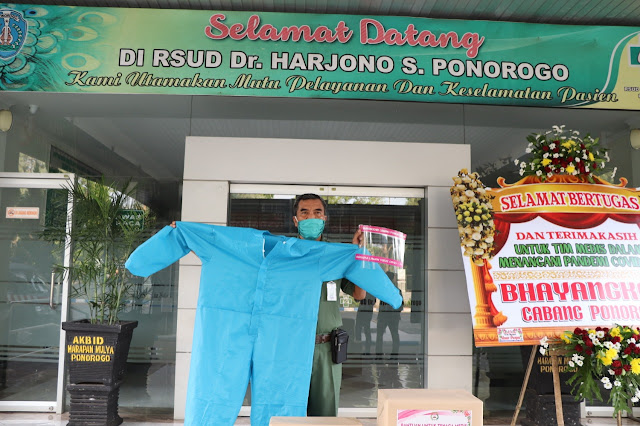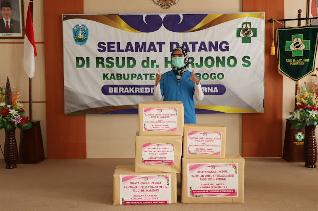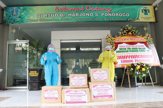 Apresiasi dan dukungan dari Bhayangkari Cabang Ponorogo tersebut diwujudkan dengan memberikan bantuan alat-alat kesehatan yakni Alat Pelindung Diri (APD), Masker Medis, Pelindung Wajah (Face Shield), Sarung Tangan Medis serta makanan dan minuman kepada para tenaga medis di RSUD Dr. Hardjono Ponorogo.